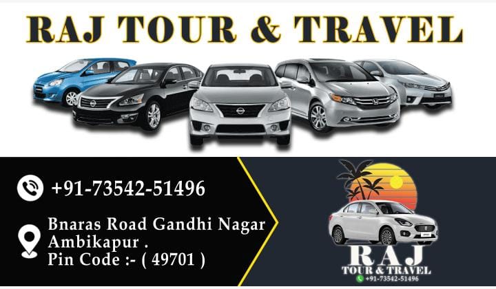 Raj Tour & Travel is a trusted travel service provider located in Ambikapur, dedicated to offering reliable and comfortable transportation solutions. With a wide fleet of well-maintained vehicles ranging from sedans to luxury cars, we cater to all types of travel needs including local sightseeing, outstation trips, and business travel. Our team is committed to providing professional service, timely pickups, and a smooth travel experience at affordable rates. We prioritize customer satisfaction by ensuring safety, cleanliness, and convenience in every ride. Whether it’s a family vacation, a solo journey, or corporate travel, Raj Tour & Travel ensures a hassle-free and enjoyable ride for all its clients. Situated at Bnaras Road, Gandhi Nagar, we are easily accessible and ready to serve our customers with dedication and care. With a growing base of happy travelers, we continue to be the preferred choice for travel services in and around Ambikapur.